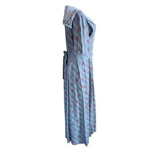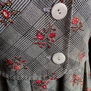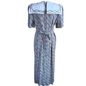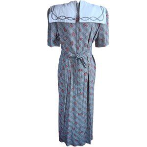 This vintage dress from the 1980s exudes charm with its classic sailor collar and intricate floral plaid pattern. The thoughtful button details and waist tie enhance its elegant silhouette, reminiscent of a bygone era. It is a versatile piece that reflects the timeless fashion of the past, adding a touch of nostalgia to your wardrobe.