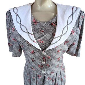 Vintage Dress 10/12 1980s Floral Plaid Dress Pad Sailor Collar JBS Secretary Mom