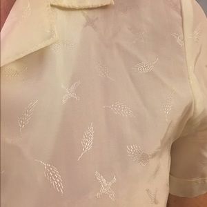 This dress can be dressed up or down. Top is silk and the skirt is linen. Very cute pattern on the silk top (birds and feathers). Waist is elastic so it's very comfortable and could fit up to a size 6. Some discoloration on the armpits but not noticeable when you're wearing it.
