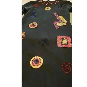 Liz Claiborne black dress made in the 1970s. BRAND NEW DEAD STOCK still has the orig tags from Liz and Robinsons. Black Long Sleeve Zip Back. Beaded and sequined by hand. A few sequin missing but overall very small percentage. Made in Hong Kong. This is a roomie small. See measurements. There is a small bag of replacement sequins.