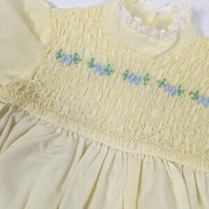 Vintage light yellow beautiful smocked dress with floral lace trim. Size is estimated as 12m. Please check the measurements provided.