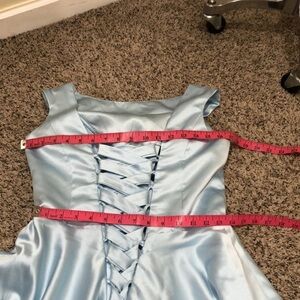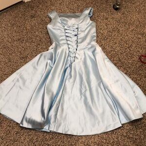 Please note the ribbon in back was cut to shorten it so it can’t be tied into a bow, but it can be tied and tucked into the dress. Short sleeve, cap sleeve, boat neck, lace up corset bodice, padded and boned bodice, fit and flare silhouette dress that falls at or a little below the knee. No tags inside but fits like 2 or XS. Not stretchy.