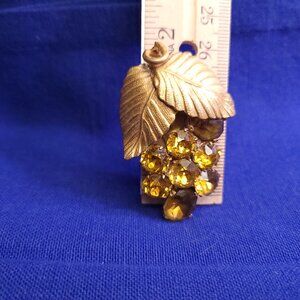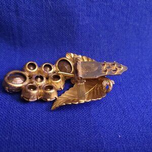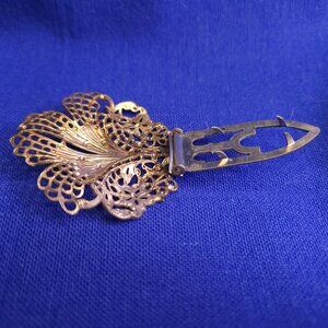 Two beautiful clips from bygone days. One clip is a gold tone with 8 topaz-colored stones, two metal leaves, and a small vine curl. This clip is approximately 2 inches long and 1 and 1/2 inches wide with the topaz stones ranging in size from approximately 12mm to 9.3mm. The stones are held in place by four-prong settings, and the two larger stones have started to discolor. The back is a snap closure with 5 prongs. This is a very nice vintage piece. The other clip is a gold tone lace approximately 1 and 3/75 inches long and 1 3/75 inches wide. The delicate lace of this clip is amazing in detail. This clip has a snap closure with four prongs. Don't forget to bundle and save!