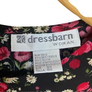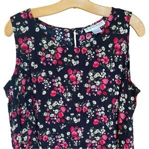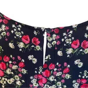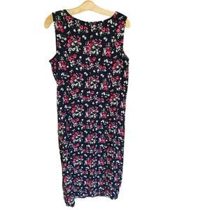 This adorable Dressbarn Woman sleeveless maxi dress is a garden party dream! Featuring a black base with scattered vibrant red tulips, dainty daisies, and white blossoms, this 100% rayon dress is breezy and lightweight — perfect for warm weather or layering under cardigans. Scoop neckline, back button keyhole, hidden side pockets (yes, pockets!), and flowy drape make this an easy, flattering wear.