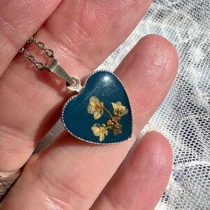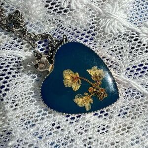 Sweet little heart necklace - natural dried flowers set against a deep blue background inside clear acrylic. This is a dainty piece on an 18” silver-tone trace chain. 90's perhaps.