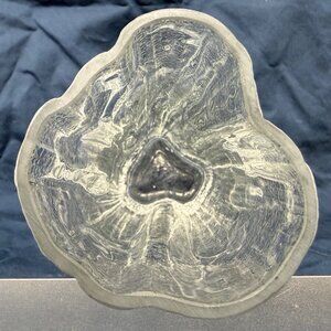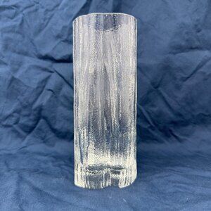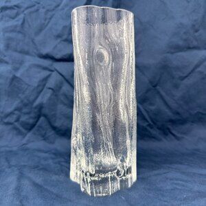 Vintage clear glass vase from the 1960s–1970s with a driftwood / tree trunk texture and an organic, uneven silhouette. Measures approximately 7.5” tall and about 3.175” at the widest point, making it a great accent for rustic cabin decor, lodge style interiors, or natural wood-toned styling.