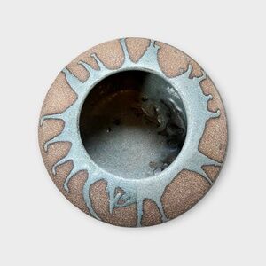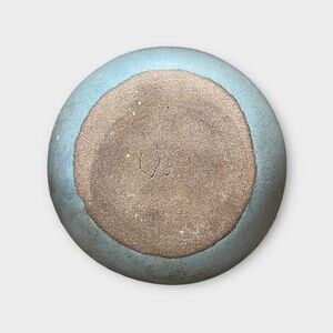 Vintage Drop Glaze Low Vase. Grey/brown stoneware clay body with a blue drip glaze.Perfect for statement styling. Style as a sculptural piece or with your favorite minimalistic bloom. Approx Size: 9" w x 3.75" h. Gorgeous!