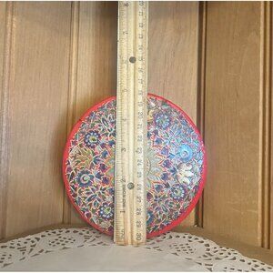 This vintage Droste cocoa tin from Haarlem, Holland, features intricate floral patterns with vibrant red and gold accents, ideal for collectors or decorative use.