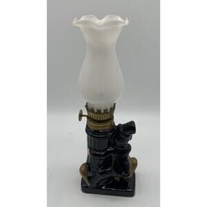 This vintage oil lamp features a unique design depicting a drunk man leaning against a lamp post on Bourbon Street. The lamp is made in Japan and is an original piece by Artmark. The lamp's ceramic material adds a touch of durability to its vintage charm.