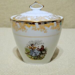 Vintage Du Centre Porcelaine R.C. Courting Couples Sugar Bowl and Lid with Filigree Gold Accent.