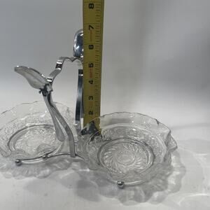 This vintage dual sugar bowl set with spoon, made in England by Sheffield, features a beautiful floral pattern in a small size with a silver color. The set includes 2 spoons, 2 glass dishes, and a dish holder, all made of stainless steel, glass, chromium, and metal. The items have shiny finishes and unique features like handles, etched glass, and spoon holders. This antique set from the United Kingdom is a charming addition to any kitchen or dining room collection, weighing 1.25 lbs and measuring 11 inches in length, 6 inches in height, and 6 inches in width.