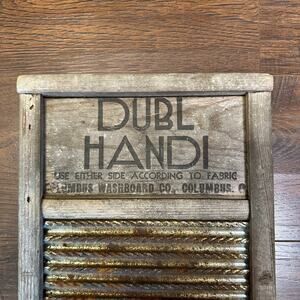 Add authentic vintage charm to your decor with this Dubl Handi washboard by the Columbus Washboard Co. Measuring 18"x9", this wooden and metal washboard is both portable and full of character—perfect as farmhouse wall art, a nostalgic accent, or even for light-duty use. Its worn patina and sturdy construction tell a story of hardworking American craftsmanship.