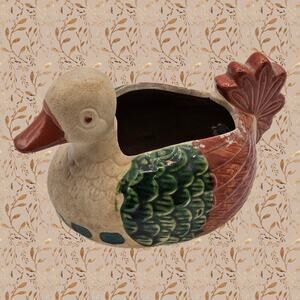 Vintage Duck Pottery Planter - Cute Garden Decor, Retro Boho Collectible. No cracks. There is some paint chipping around edges on feathers due to age. Add a touch of whimsy to your garden with this adorable vintage duck shaped planter pot! This retro boho pottery collectible is sure to be a charming addition to your outdoor space. The cute duck design adds a playful vibe, perfect for adding character to your garden decor. Whether you use it to display your favorite plants or simply as a decorative piece, this unique planter pot is a must-have for any vintage lover or collector. Bring a nostalgic feel to your garden with this delightful duck planter pot today!