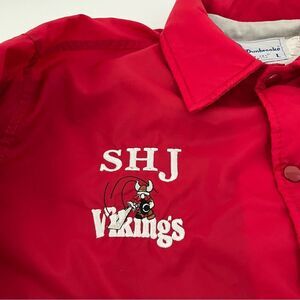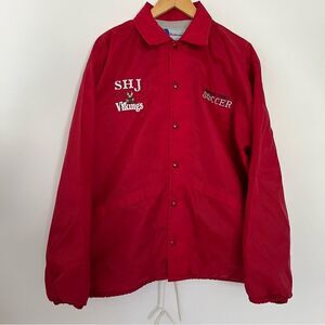 Red button down collared track jacket / windbreaker. Drawstring waist, ribbed cuffs, and ‘SHJ Vikings’ embroidered on one side, and ‘Sacred Heart Soccer’ on the other.