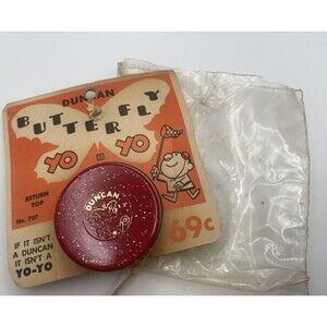 For the collector this butterfly yo-yo is from 1958 and is on original card in original bag. The Yo-yo is made of wood and comes in red color. String has yellowed and so has card. This is the original card which shows how to do the spinner on back. This is a great collectible find and this model is displayed in the museum of yo-yo history. Comes from a smoke-free home.