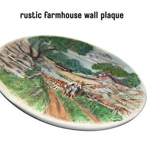 Charming vintage country farm scene ceramic plate hand-painted with a raised 3D design of a mill, river, and country lane. Made from a Byron Mold (1972) and hand-finished by a Duncan Ceramics student around 1990. Large at 14” across, this rustic farmhouse wall plaque makes a great statement piece for a country kitchen, cabin, or wall gallery.