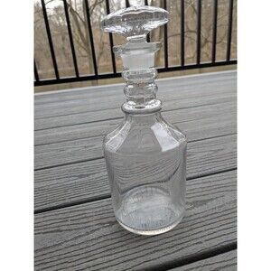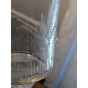 This vintage Duncan & Miller 1930s 10" glass decanter features an ice-clear glass with an etched wildlife pattern of ducks in flight over grasses. The set includes a ground glass decanter stopper that fits snuggly and a decanter, both made of washable glass/possibly crystal. This barware item from the 1930s is a charming addition to any collection with its wildlife theme and elegant design.