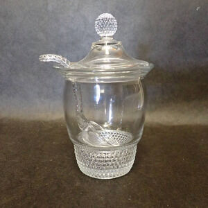 Vintage Glass Mustard Jar with Spoon, Duncan & Miller, Teardrop Pattern, Clear Glass,