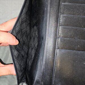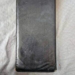 This sleek and sophisticated vintage Dunhill bifold wallet is crafted from thin black leather with elegant gold accents, offering a refined and timeless look. Despite some wear on one corner and some creasing on the back (pictured), it remains in overall good condition with plenty of life left.