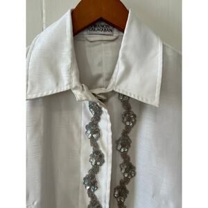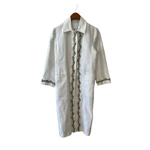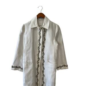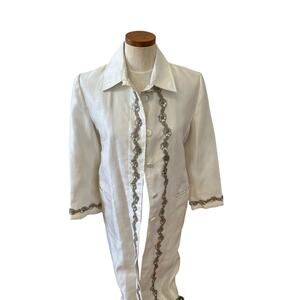 Vintage Francis Calaquian white Dupioni silk long dress jacket with gorgeous silver beading and sequin trim. No size or materials tag, seems to fit like a M