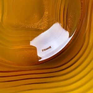 Crafted in France by Duralex, this large vintage amber glass bowl is a stunning example of mid-century modern utility and style. The distinctive ribbed swirl design and golden amber hue give it a sculptural presence—ideal as a functional serving piece or statement display.