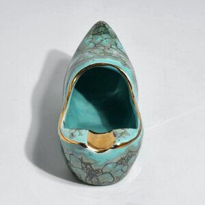 This vintage ceramic shoe dish originates from Holland, showcasing exquisite craftsmanship with a turquoise glaze, intricate patterns, and gold accents. It combines functionality and decorative appeal, perfect as a trinket holder or a collectible piece, reflecting Dutch artistry and timeless charm.