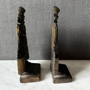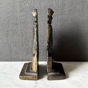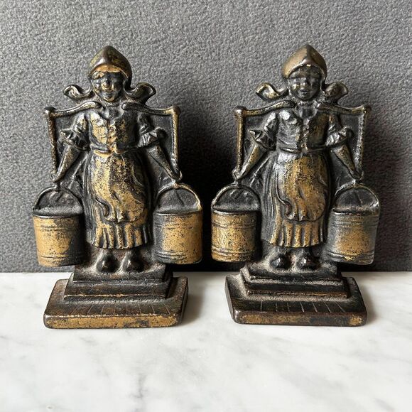 Set of vintage Dutch girl bookends. Cast iron bookends feature a Dutch girl carrying pails of milk and are in excellent vintage condition with normal wear and beautiful patina. Each bookend measures 6-1/8" high x 3-3/8" wide base x 1-3/4" depth.