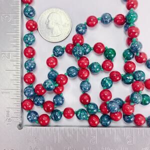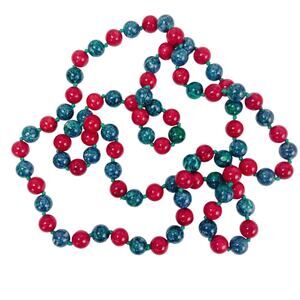 A vibrant strand of polished stone beads in bold red and marbled blue-green brings a playful mid-century energy to your look. Hand-knotted construction adds both durability and vintage charm.