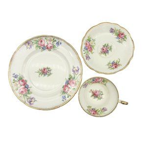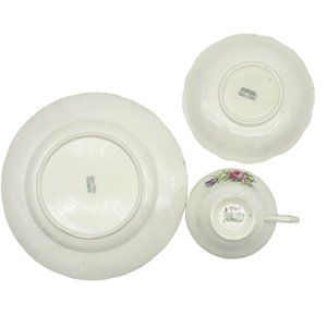 Vintage E. Brain & Co Ltd English Bone China Foley Tulip 8 inch Plate Cup Saucer - Charming teacup, saucer and plate made by the Foley China, E. Brian Company in the Tulip pattern. A floral design on the interior and exterior of the cup and on the saucer and plate make this a special item. Gold accent. This would be a wonderful addition to any collection or gift. 1950s