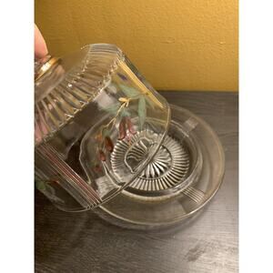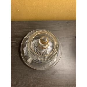 This vintage EAPG Flint Glass Regina Rib Band Floral Covered Butter Cheese Dish is a 2-piece set featuring a round under plate measuring 7 1/4" and a lid measuring 5". Made of clear flint glass in an Art Deco style, this decorative butter dish showcases a floral pattern and intricate rib band design. Standing at 7" in height and 7" in width, this American-themed piece is a unique addition to any collection. The brand is unmarked, and it is recommended to hand wash only.