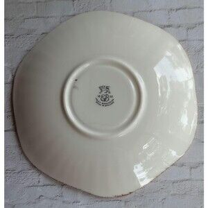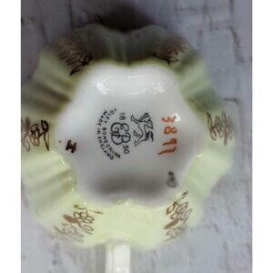 Vintage EB Foley Bone China Tea Cup and Saucer. Light yellow green color features gold filigree with pale pink and grey rose accents. Ruffled cup edge is lovely. No chips or cracks.