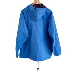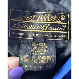 Vintage Eddie Bauer woman's Gore-Tex jacket. Jacket is blue with hot pink accents. It's hooded with a full zip front and snaps. Jacket has two side snap zip pockets It's made of 100% nylon with a nylon lining. Jacket is a woman's size large.