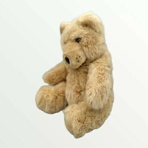 This vintage Eden NY shaggy teddy bear features airbrushing spots on its tan brown fur, adding to its unique charm. Standing at 12 inches tall, this plush bear with a vinyl nose is a one-of-a-kind collectible from the 1980s. Crafted in Korea, this original teddy bear captures the nostalgia and craftsmanship of a bygone era, making it a special addition to any teddy bear collection.