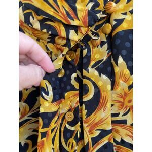Beautiful find from the 80's. in excellent vintage condition. no holes, no wear or tear, vibrant colors. 100% polyester, fully button down ladies blouse. Front closure buttons, while fabric covered, are also hidden under the placket. The neckline is a ruched high gathered look with covered button and loop closure to the side . The billowy sleeves end in ruched cuffs with covered button and loop closure. Beautiful pleats in this top but the eye catching feature is truly the coloring. Black on black with silky polka dots in the background with a gold and metallic polka dot floral pattern. very striking and feminine shirt. Beautiful for your vintage collection. dressy or casual.