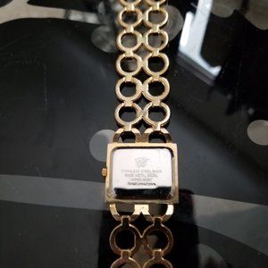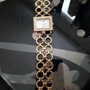 Watch with wide linked band, square face and faux diamonds, Still have protective cover on back. Does need a battery