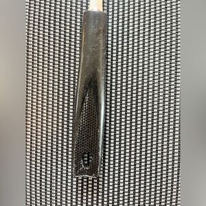Vintage EKCO USA Metal Slotted Keyhole Serving Spoon with a 12" black corn cob handle is a unique and nostalgic piece of flatware. Made in the United States during the 1960s, this original vintage spoon features a retro style with a satin finish. The spoon is reusable and dishwasher safe, making it practical for everyday use. The black plastic handle and slotted design add functionality to the stainless steel construction, making it a versatile addition to any kitchen collection.