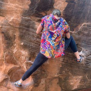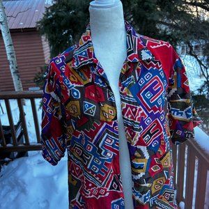 Colorful 80s silk gigolo-style button-down top. Has been worn and gone on lots of adventures but still has tons of life left to live.