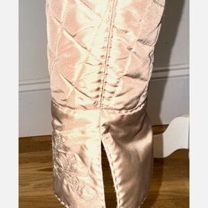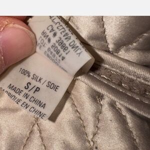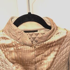 The Vintage ELIE TAHARI Silk Jemina Victorian Embroidered Quilted Artwear Jacket in size Small is a stylish and unique piece for any woman's wardrobe. Made from 100% silk, this short jacket features long sleeves and a hook & eye closure. The beige color and intricate embroidered accents give it a vintage charm that is perfect for all seasons. Ideal for those who appreciate artisanal pieces with a touch of Victorian elegance, this Elie Tahari jacket is a timeless addition to any collection. With green mark inside