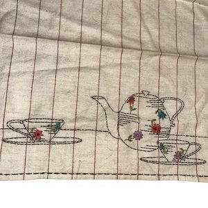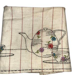 Vintage EMBROIDERY hand stitch Tea for two teacups kettle tea towel