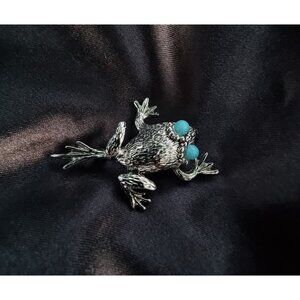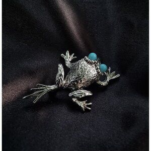 Vintage EMMONS Signed Silver Frog Faux Turquoise Eyes Brooch Pin