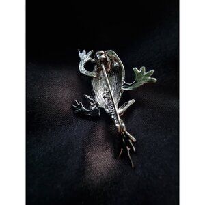 This is a charming vintage brooch by Emmons, shaped like a frog. It has faux turquoise eyes and is made of silver tone metal. The brooch is signed "Emmons" on the back, proving it's genuine. It's in great condition, with minimal wear. This brooch is perfect for adding a fun touch to any outfit.