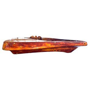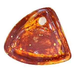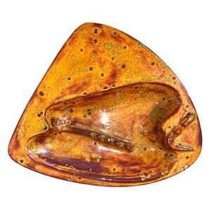 This handcrafted mid-century modern ceramic ashtray features a distinctive triangular design with a striking brown and yellow glaze. Its artistic pattern and vibrant colors make it an eye-catching addition to any decor. Ideal for collectors or those seeking a unique interior statement piece.