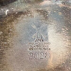 The Vintage EPNS (Electro Plated Nickel Silver) Mulholland Guaranteed 18% Nickelbase 2028 Footed Tray is a luxurious silverplate piece from the early 20th century. This elegant tray, measuring 10 1/4” x 3”, is adorned with an intricate leaf design. A fantastic addition to any collection or setting.