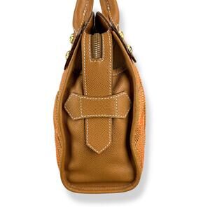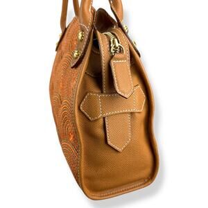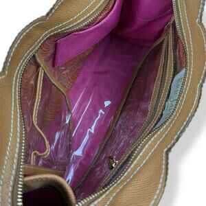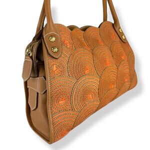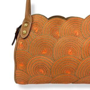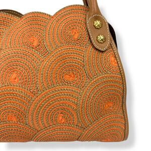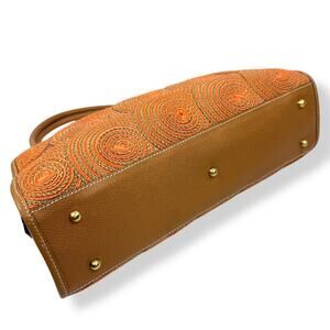 Vintage ERIC JAVITS NEW YORK raffia woven leather handbag. Hand crafted in New York by designer Eric Javits. Beautiful natural and orange raffia woven in a unique circular pattern on the front and back. Tobacco fine genuine leather trim. Gold hardware and gold feet on bottom. Fully zippers shut along the top. Inside is immaculately clean pink fabric with clear plastic so its super easy to clean. There is a full zippered c lear pocket and two additional smaller pockets. ERIC JAVITS logo on pocket. This bag is in pristine vintage condition and looks brand new! Measures 11" along top, 12.5" along middle, 14" along bottom, 9.5" tall and 3.5" deep. Strap drop measures 7.5". Originally $650 at Saks Fifth Avenue.