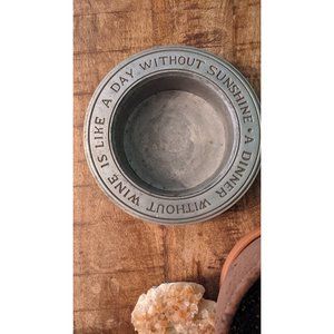 Vintage Eales 1779 pewter wine bottle holder engraved with the saying "A Dinner Without Wine is Like A Day Without Sunshine" along the outer rim. A more true statement has never been uttered! Always a nice reminder to charm guests and make you smile whenever it's in use. A perfect gift for a wine/vintage lover, this would be an excellent housewarming present.