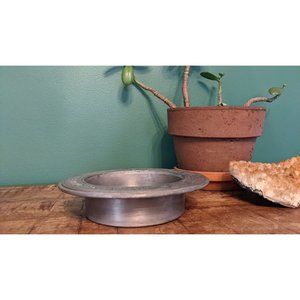 Measures approx 6.75 in wide, with an opening of 4.5 in and is 1.5 in tall. Excellent vintage condition, some oxidation as expected with age. Pewter can be cleaned, if you prefer a higher polish however the item will ship with the original patina. Blue felted bottom to prevent scratches to your tabletops.