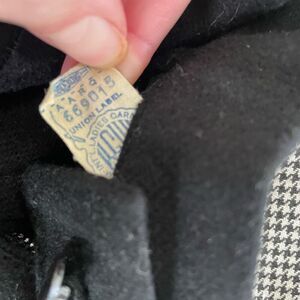 Early 60s 100% wool black… Looks like an A-line skirt but it is actually Coulottes! Teeny, tiny size. I used the ILGWU label to date the item. Three button closure at the waist that hides a metal zipper. The center button is missing, but it’s a standard button that could easily be replaced. With the zipper behind it it isn’t necessary for modesty. The metal zipper is stamped Murlin. Very high-rise with a 14.5 inch rise. Measures 10.5 inches straight across the waist and there is an 11 inch inseam. I’ve checked for moth holes and detected none. This is a really nice garment. The only tag is the union tag on the inside.