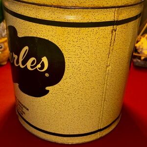 Vintage-style Charles Chips tin in yellow with black accents. Perfect for storage or decor.