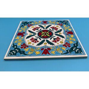 Very early 6" x 6" H & R Johnson raised glaze art tile. It's marked 'Made in Greece by Philkeran Johnson'. This piece hung on a kitchen wall at an estate in northern Nevada hence the discoloration on the back. The non-glazed porous ceramic really absorbed the elements. The hook is affixed with hot glue. Can be removed and replaced (or not) by new owner if desired. Please see photos. Thanks for looking!