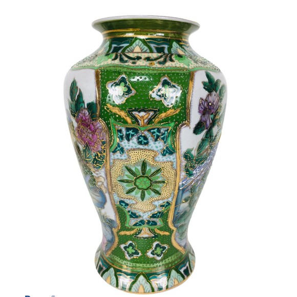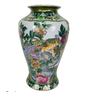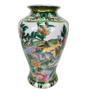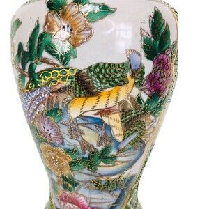 keywords: vintage, antique, Asian, Chinese, vintage Chinese art, hand painted, moriage, gold, peacock, colorful, large vase, vintage Chinese vase, rare, hard to find, unique, flowers,